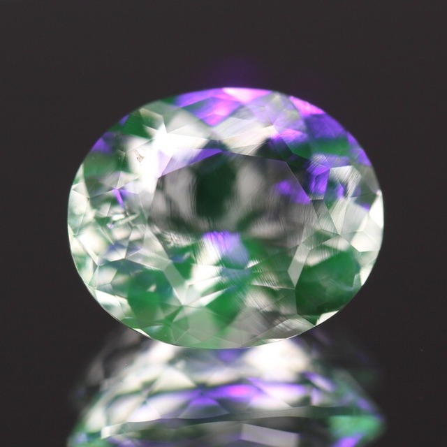 ハイアライトオパール 1.340ct. 8.64×7.23×4.98 ハンガリー産 オーバルキューブ ゲオちゃん作品 日独鑑別書・産地証明付き 数少ないハンガリー産のハイアライトオパールです。 多様な種類が存在するオパールの中で、最も希少性が高いとも言われている「ハイアライトオパール」。 シーンによって表情を変える 瑞々しいグリーンの光をお楽しみください。 流紋状のゆらゆらした独特のインクルージョンもお楽しみ頂けます。 とにかく透明度が高く、眩しい程しっかりと蛍光するハイアライトオパールを、お仕立てしやすいオーバルにGemTreeJapanの独自カットであるキューブカットが施された過去カッター:ゲオちゃん作品。 あまりにも強蛍光なピースなため、UVライトを遠くから弱くあてキューブカットをよりご覧いただけるように撮影致しました。 【産地】 メキシコ ・ハンガリー 【和名】 玉滴石 【モース硬度】 5-6.5 【光沢】 ガラス光沢-樹脂光沢 【屈折率】 1.44 【比重】 2-2.25 #GemTreeJapan #オパール #ハイアライトオパール