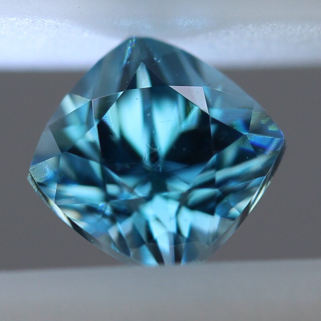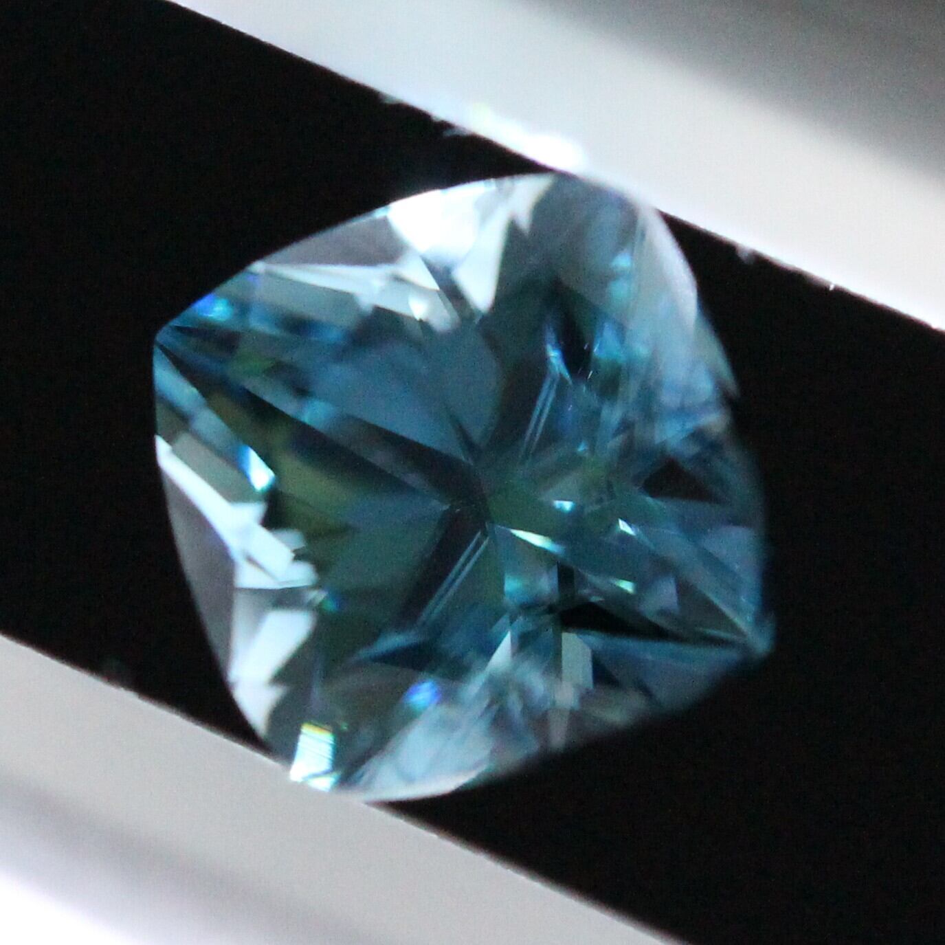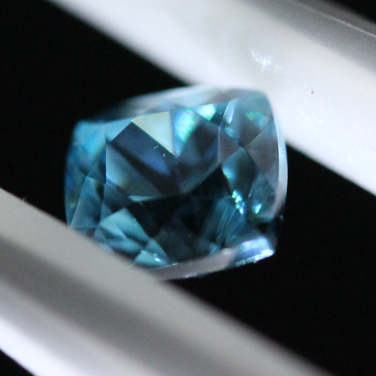 カットは、一般的なプリンセスカットとは異なるアレンジが加えられており、鮮やかで清んだブルーは、個人的に若干パライバトルマリンのようなネオン感も感じられます。